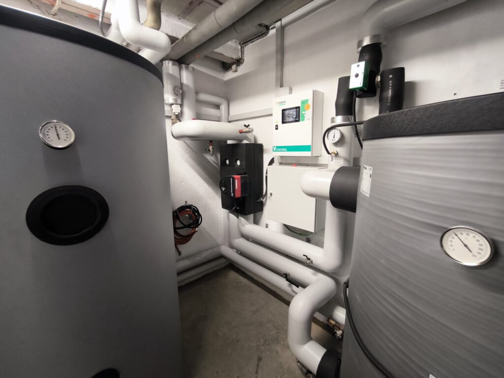 Im bestehenden Mehrfamilienhaus aus dem Jahr 1918 wurde die alte Ölheizung durch eine effiziente Luft-Wasser-Hochtemperatur-Wärmepumpe (31 kW, R290) ersetzt. Die Anlage versorgt die Radiatoren sowie den Warmwasserspeicher und wird durch einen Heizungsspeicher für einen optimierten Betrieb ergänzt.