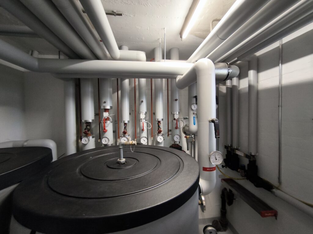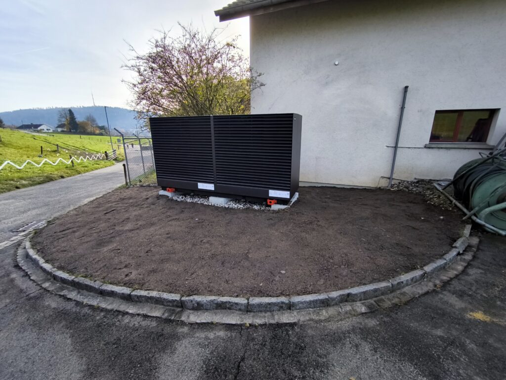 Installiert wurde eine leistungsstarke, modular aufgebaute Luft-Wasser-Hochtemperatur-Wärmepumpe (R290) mit rund 60 kW Heizleistung. Ein Heizungsspeicher optimiert den Betrieb und reduziert Schalthäufigkeiten. Der Öltank und die Abgasanlage wurden ausser Betrieb genommen; veraltete Pumpen, Regler und Messgeräte ersetzt.